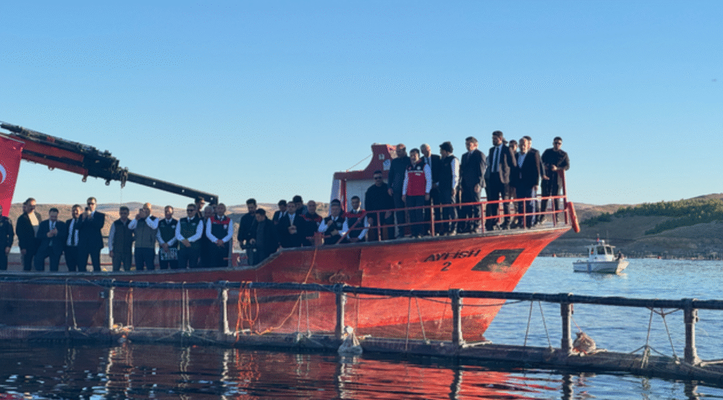 Tekneyle Keban Baraj Gölü’ne açılan Yumaklı, kafeslerdeki balıkları inceledi, yetkililerden bilgi aldı.